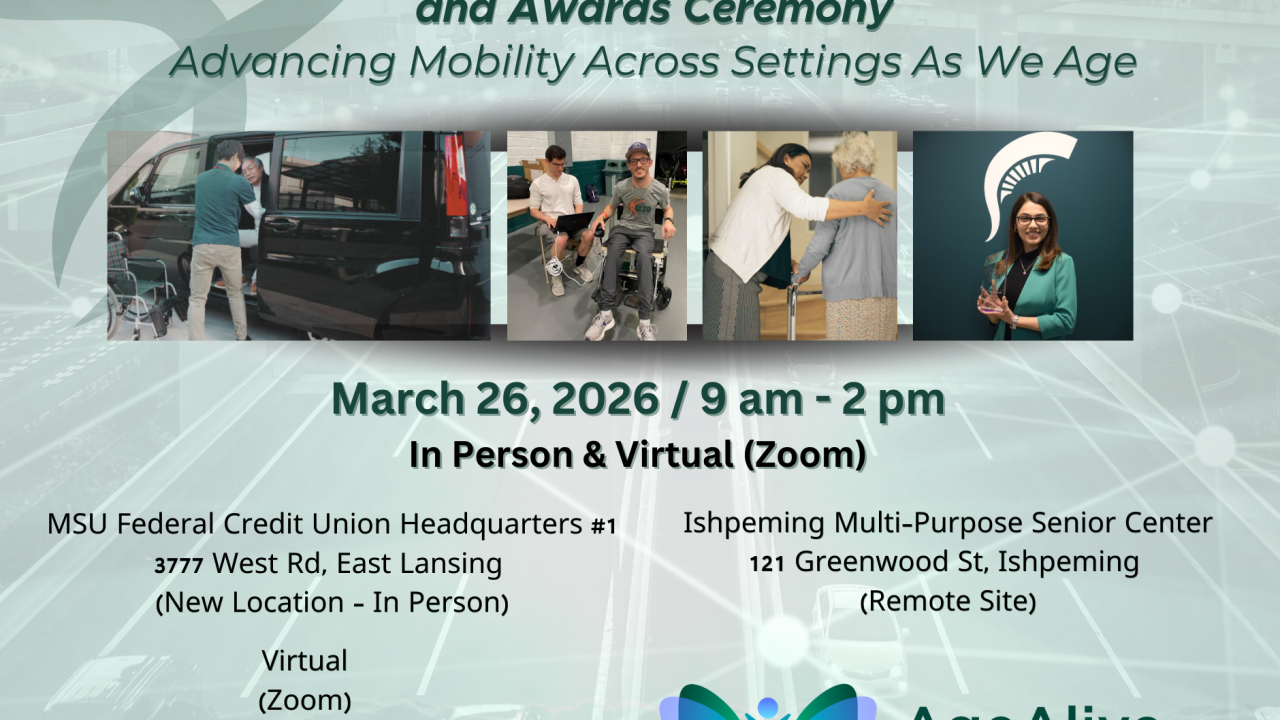 Save the date for the upcoming MSU AgeAlive Education & Research Forum, “Advancing Mobility Across Settings As We Age,” from 9 am – 2 pm, at the MSU Federal Credit Union Headquarters #1 (3777 West Rd, East Lansing). Attendees can also participate through a remote viewing site at the Ishpeming Multi-Purpose Senior Center (121 Greenwood St, Ishpeming) and virtually on Zoom. The AgeAlive Annual Awards Ceremony will be held in conjunction with the Forum. To sign up to receive Forum registration information, email picotte@msu.edu. Registration will open in late-January.